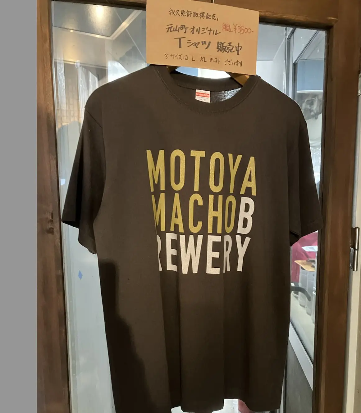 2つのタープテントの間を縫ってお店の扉を開くと中はカウンターがメインのタップルーム。その奥には醸造設備は透明なガラスドア(ブルワリーオリジナルのTシャツがかかっていましたが)の先に見えており、出来立てのクラフトビールがここから提供されるのかと想像するとテンションもあがります。